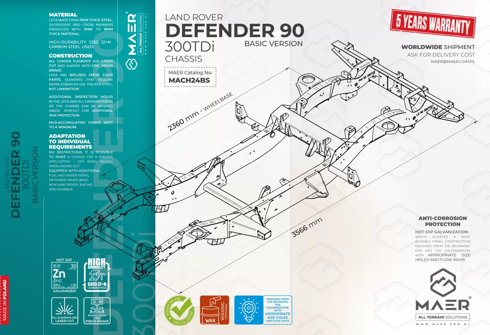 All chassis elements are laser cut and shaped with CNC press brake.Legs are welded from four parts. Elements that require extra strength use thicker steel, not lamination! Additional inspection holes in the legs and all crossmembers so the chassis can be washed inside. Perfect for additional wax protection. Mud-accumulating points kept to a minimum. All chassis are ready for the wiring loom and equipped with a pulling rope.