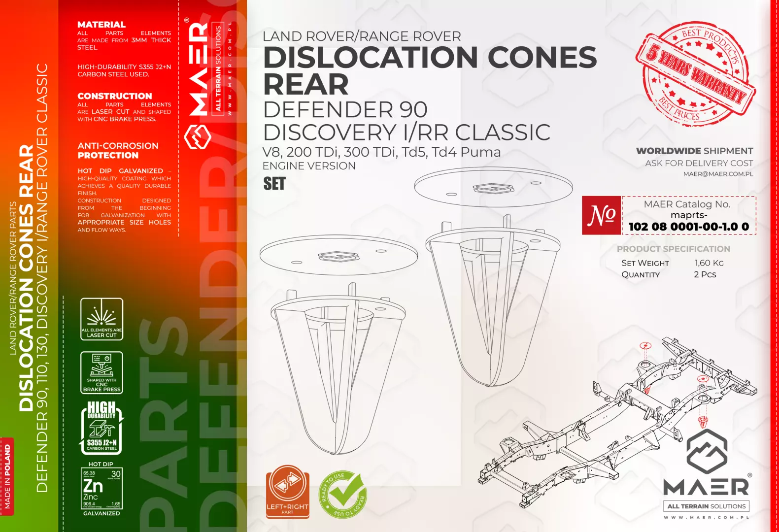 Land Rover DEFENDER 90 DISCOVERY I/RRC V8, 200 TDi, 300 TDi, Td5, Td4 Puma GALVANISED DISLOCATION CONES REAR set