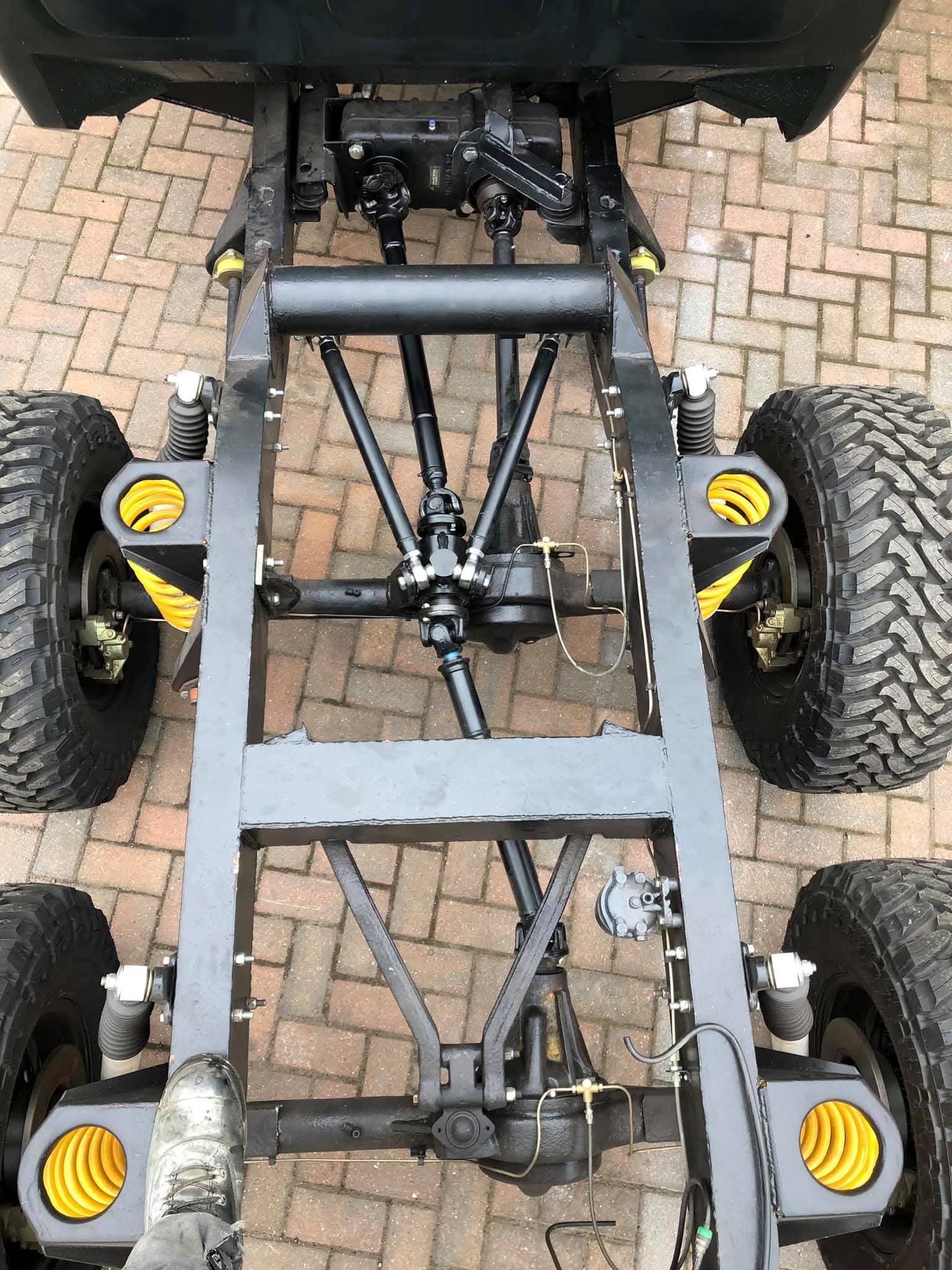 All chassis elements are laser cut and shaped with CNC press brake.Legs are welded from four parts. Elements that require extra strength use thicker steel, not lamination! Additional inspection holes in the legs and all crossmembers so the chassis can be washed inside. Perfect for additional wax protection. Mud-accumulating points kept to a minimum. All chassis are ready for the wiring loom and equipped with a pulling rope.
